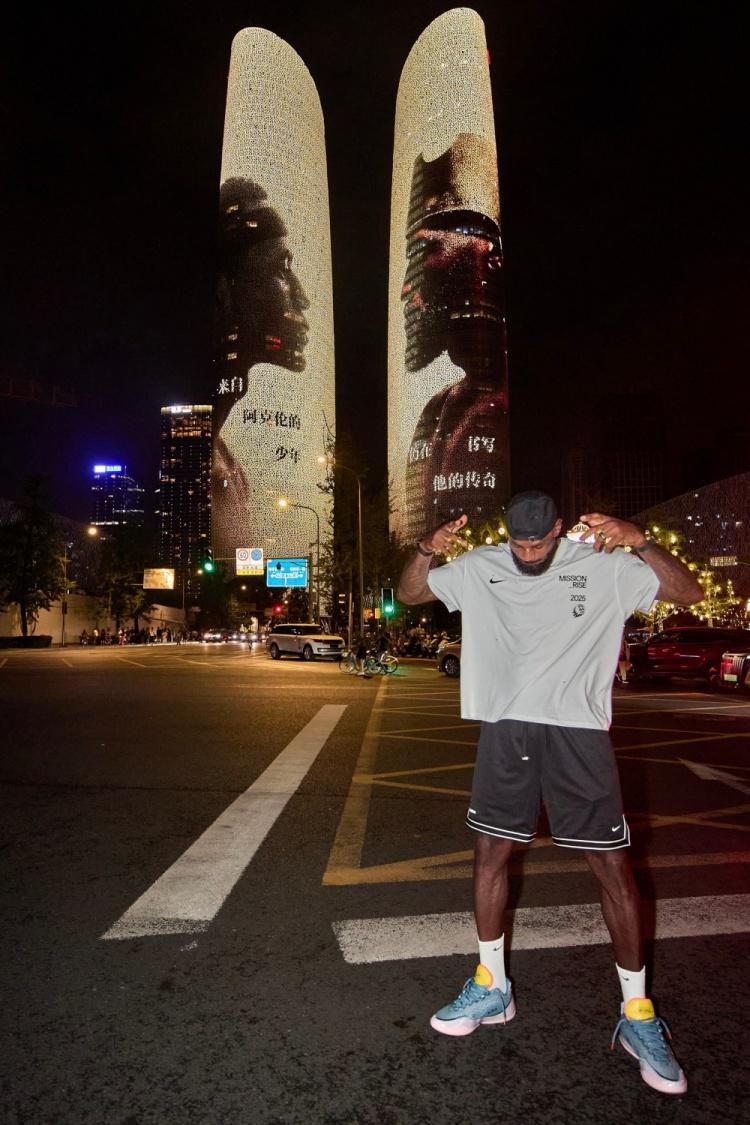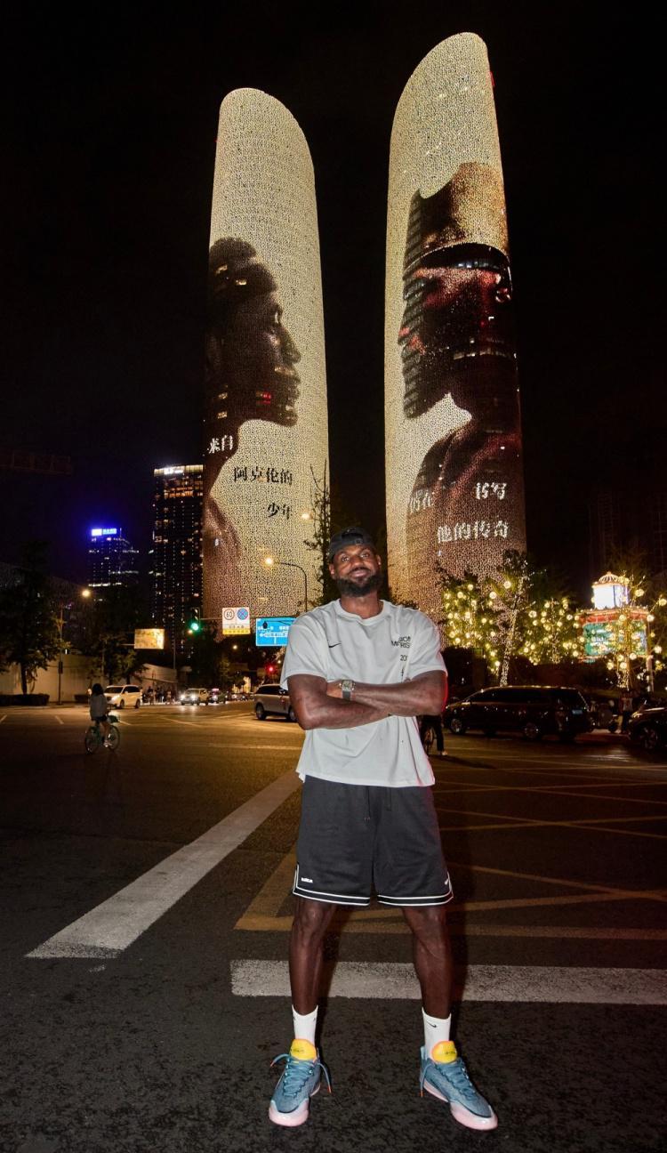 詹姆斯昨晚离开之前,特意来到成都金融城双子塔前,与致敬自己的灯光秀画面合影,并做出佩戴王冠招牌动作。